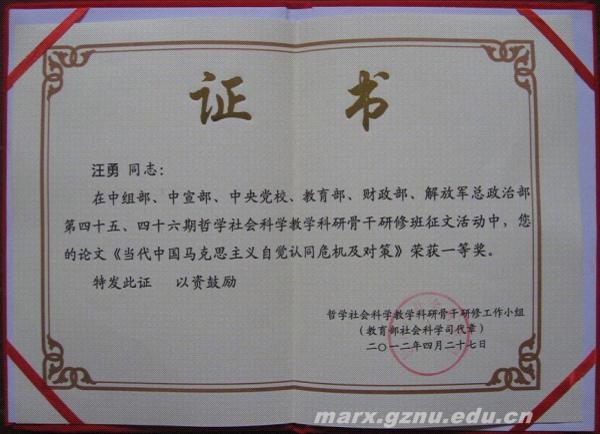 根据研修要求,汪勇积极撰写论文参加征文比赛,在第45、46期共216名学员提交的81篇参赛论文中,经领导小组及班委坚持公平、公正、公开的评审原则,一共评出获奖论文9篇(其中一等奖2篇,二等奖7篇)。在结业典礼上,中宣部副部长、教育部社科司司长等部门领导参加并公布了2026世界杯官方网址汪勇撰写的《当代中国马克思主义自觉认同危机及对策》荣获一等奖等评选结果并发给荣誉证书,为公司、公司和自己争得了荣誉和光彩。