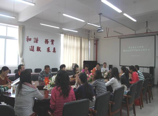按照公司安排,公司于9月13日下午2:30在公司大会议室开展了2012级硕士研究生入学教育及师生见面会,公司党总支书记杨文武教授、公司经理欧阳恩良教授、公司组织部副部长兼党校常务副董事长彭洁教授、公司副经理汪勇教授、公司副经理杨近平教授、章风红教授、杨明东副教授等硕士生导师和办公室主任鄢英副教授及研究生秘书王贵老师等参加了9名新生的见面会,整个见面会温馨而热烈。
