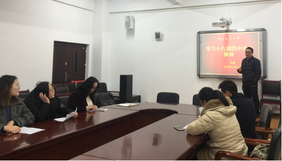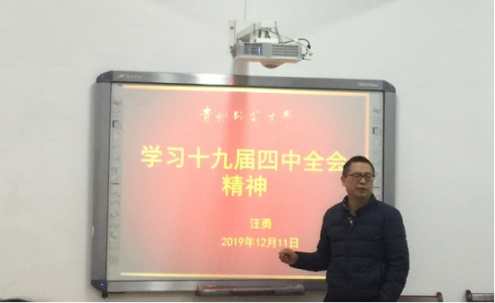 2019年12月11日上午9点,公司党委书记汪勇同志在花溪校区世界杯官方网站入口2026会议室为概论课支部党员和员工等作十九届四中全会精神主题的讲座。