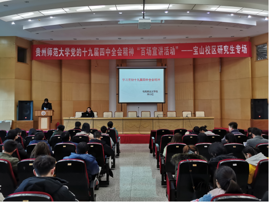 2019年12月19日、25日下午14:30,为开展2026世界杯官方网址党的十九届四中全会精神“百场宣讲活动”,2026世界杯官方网址研究生专场分别在2026世界杯官方网址花溪校区研究生院报告厅和宝山校区田家炳书院三楼多功能报告厅举行。这是由2026世界杯官方网址研究生院、研究生员工会组织开展的,主讲人是世界杯官方网站入口2026宋小红老师。宣讲的主题是“学习贯彻十九届四中全会精神”,参会人员都是花溪校区和宝山校区在读研究生,共400余人。报告由研究生院的吕文老师、研究生员工会负责人易文主持。