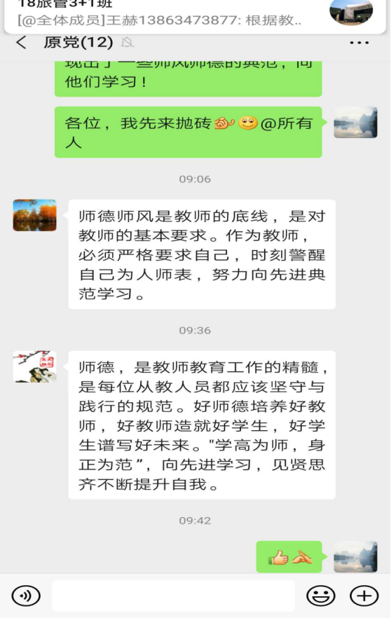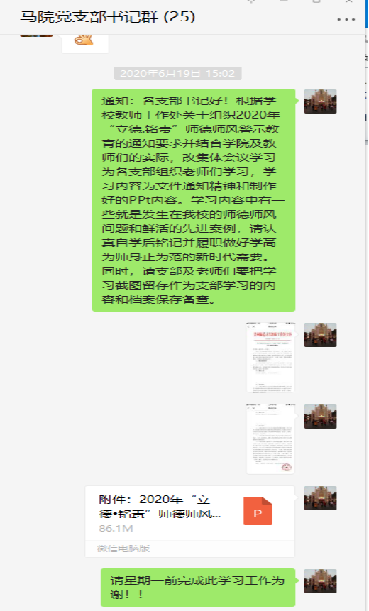 根据《关于组织开展2020年“立德•铭责”师德师风警示教育的通知》(校师通字【2020】11 号)要求,公司在6月19日收到文件后高度重视并立即对学习活动进行精心部署安排。书记亲自通知各支部认真组织学习领会,各党支部和教研室当天下午就积极组织安排各支部党员、教研室教师通过网下的集中学习、线上的微信群和QQ群学习、自主学习等多种学习方式开展学习活动并取得了一定的效果。