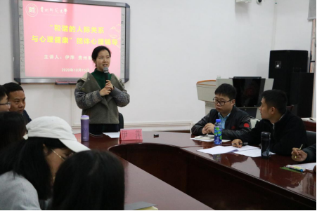 2020年10月15日下午,公司在花溪校区公司一楼会议室举办研究生入学教育系列活动之二--“和谐的人际关系与心理健康”团体心理辅导,本次活动特邀贵州财经大学心理与健康老师伊萍主讲,世界杯官方网站入口20262019级、2020级全体研究生参加,会议由世界杯官方网站入口2026王贵老师主持。