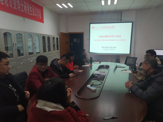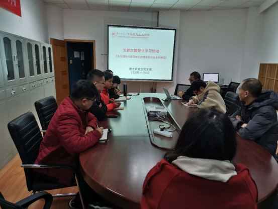 2020年11月5日晚19:30,世界杯官方网站入口2026博士研究生党支部全体党员在宝山校区文科楼三楼小会议室集中学习《在全国抗击新冠肺炎疫情表彰大会上的讲话》。