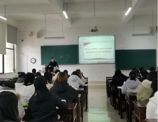 韩玮老师主要围绕“准确把握全会召开的深刻背景”、“深入学习领会全会的主要精神”、“深入贯彻落实全会精神推动贵州高质量发展”三个方面进行讲解。首先,韩玮老师提到,党的十九届五中全会是在全面建成小康社会、实现第一个百年奋斗目标之后,趁势而上开启全面建设社会主义现代化国家新征程、向第二个百年奋斗目标进军的关键会议。其次,韩玮进一步阐释了十九届五中全会的主要精神,并指出“十四五”时期必须遵循的主要原则以及推进“十四五”时期高质量发展的战略举措。再次,他指出,应深入贯彻落实全会精神,以十九届五中全会精神为指导,抓住机遇,补齐短板,推动贵州不断迈向高质量发展的新征程。最后,韩玮老师提出殷切希望,希望各位同学能够以一名优秀党员的标准严格要求自己,脚踏实地,做好新时代的接班人。
