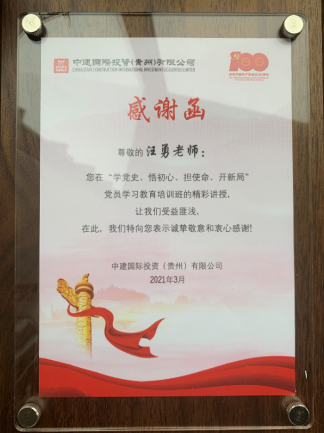 中国国际投资(贵州)有限公司60余名党员领导干部听完汪勇经理的专题讲座后,在中场休息时间纷纷与汪勇经理交流,认为汪勇经理的讲座紧密结合实际,鲜活、有力并深受教益。为此,中国国际投资(贵州)有限公司还专门给汪勇经理赠送了感谢函。
