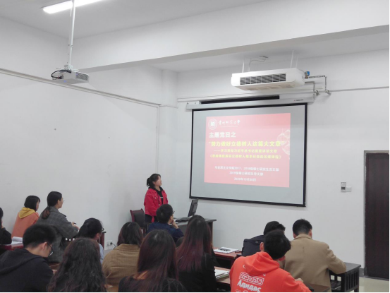 活动中,雷蕾首先对《思政课是落实立德树人根本任务的关键课程》重要讲话作了简单介绍,她介绍了这篇讲话文章提出的时代背景,即党中央关于党对教育工作的全面领导以及办好中国特色社会主义教育的一次重大战略部署,是时代要求,同时也是民之所向。随后,支部全体党员对文章中关于思政课教师素养的问题和推动思政课改革创新提出的“八个统一”相关内容进行了学习。思政课教师提高素养要做到“政治要强、情怀要深、思维要新、视野要广、自律要强、人格要正”,在思政课改革创新中要做到“坚持政治性和学理性相统一;价值性和知识性相统一;建设性和批判性相统一;理论性和实践性相统一;统一性和多样性相统一;主导性和主体性相统一;灌输性和启发性相统一;显性教育和隐性教育相统一。”最后,雷蕾强调大家要认真学习好习近平总书记《思政课是落实立德树人根本任务的关键课程》这篇重要文章,不仅要学懂、弄通,还要悟透。