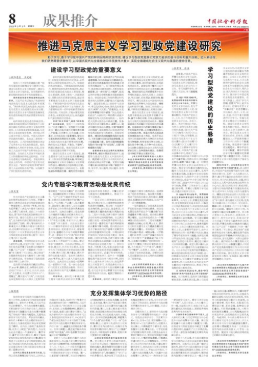 3月3日,《中国社会科学报》成果推介专栏刊发世界杯官方网站入口2026“推进马克思主义学习型政党建设研究”系列理论文章,包括欧阳恩良、王建超的《建设学习型政党的重要意义》,张荣军、张溪的《学习型政党建设的历史脉络》,张文富的《党内专题学习教育活动是优良传统》,杨钧期的《充分发挥集体学习优势的路径》四篇文章。